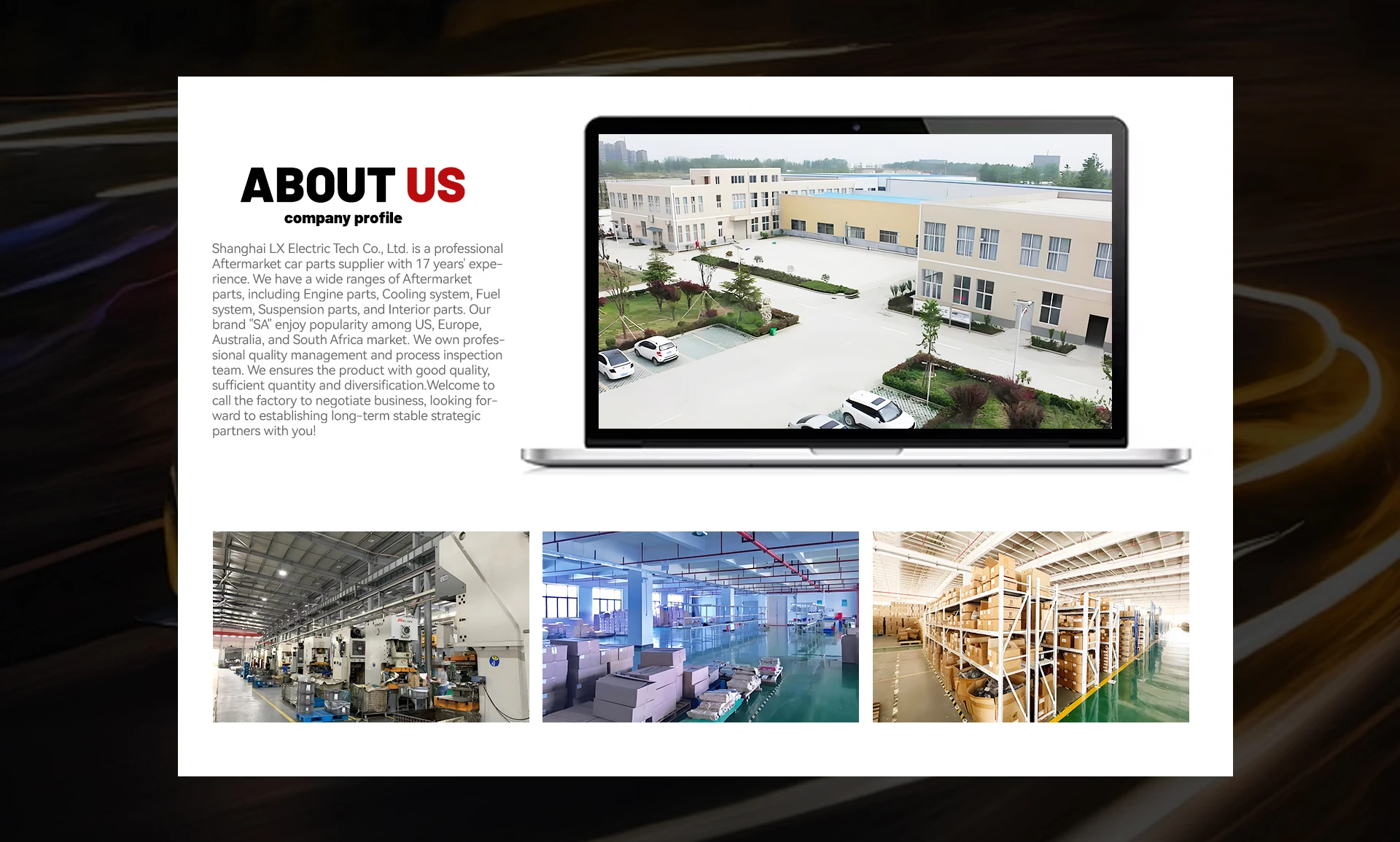 Shanghai LUXI Electric Tech Co., Ltd. is a professional Aftermarket car parts supplier with 17 years' experience. We have a wide ranges of Aftermarket parts, including Engine parts, Cooling system, Fuel system, Suspension parts, and Interior parts.